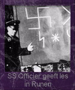 Een bewaarde foto toont een SS-officier voor een schoolbord die een klas SS-rekruten de runentekens leert.